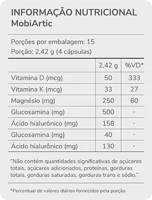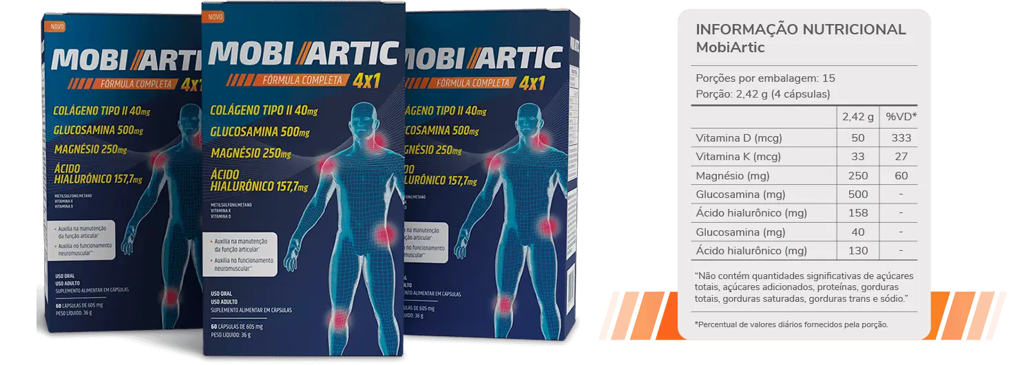MOBIARTIC é um suplemento vitamínico desenvolvido para proteger as articulações da dor e promover a recuperação articular.