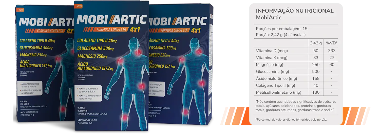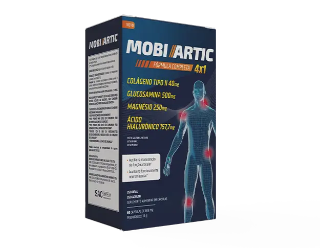 MOBIARTIC é um suplemento vitamínico desenvolvido para proteger as articulações da dor e promover a recuperação articular.